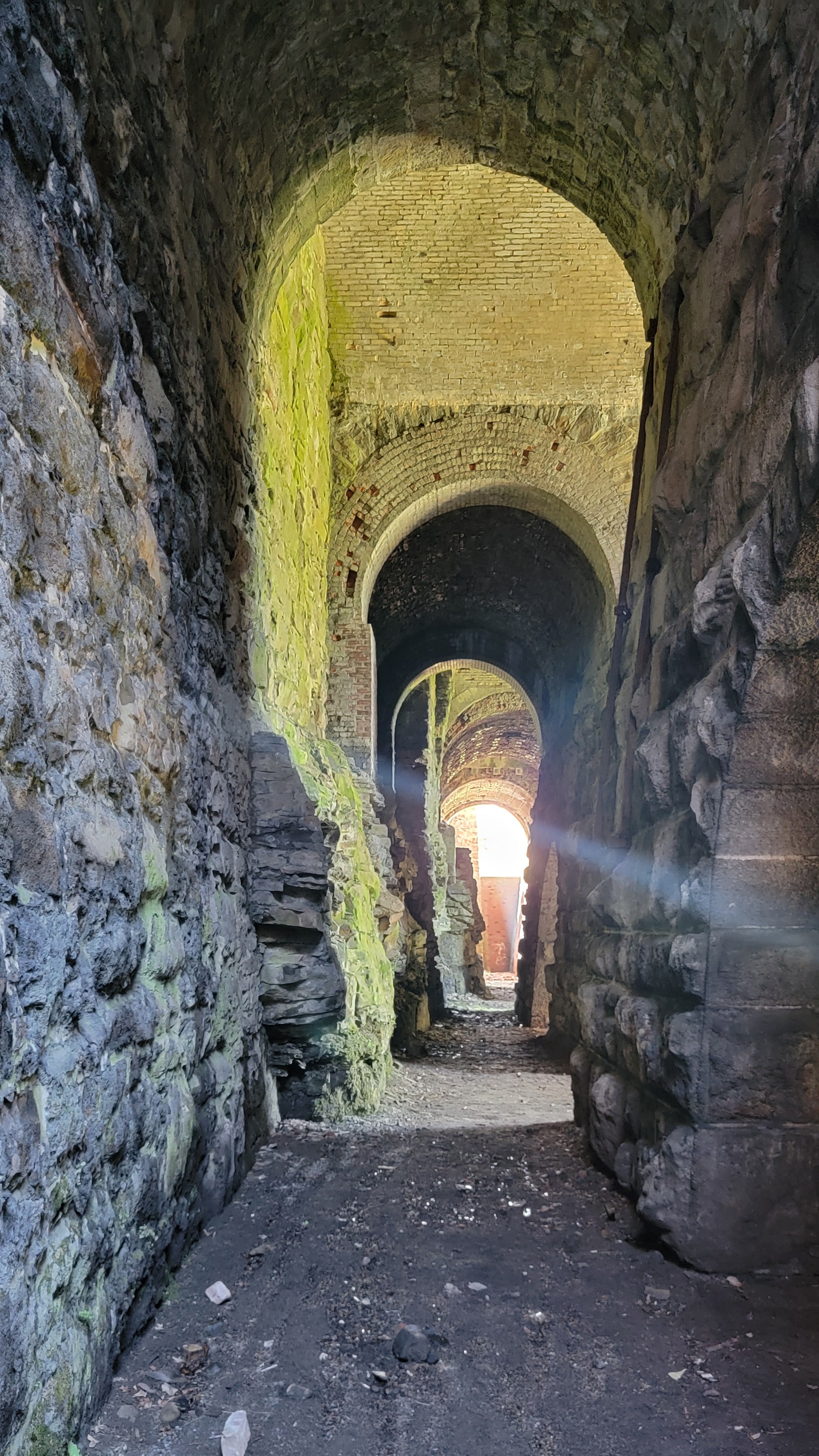 | looking down the length of the rear of the furnaces |